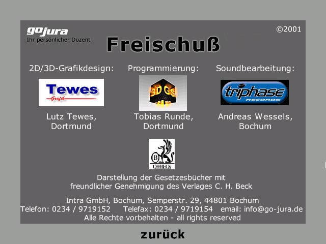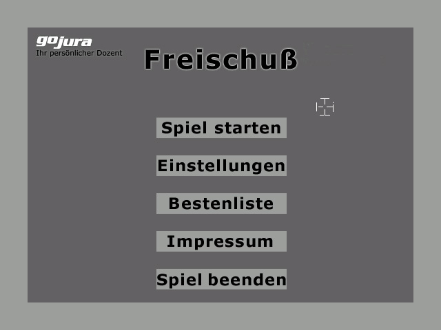 Freischuß ist ebenfalls ein kurzweiliger Schafjagd-Klon, bei dem Sie Gesetzbücher abschießen können. Die Spezialwaffen sind hierbei Paragraphen (§), mit denen sie gleich ganze Bücheraufen treffen können. Das Spiel wurde für die Intra GmbH entwickelt, und ist Teil der go-jura CDs. |