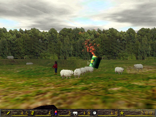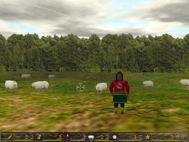 Sie haben allen Klonen den Garaus gemacht. Alle Klone des ersten Schafs sind vernichtet. Sie haben vom Gen-Labor einen richtigen Batzen an Schweigegeld erhalten. Obendrein haben Sie noch eine Anstellung als Nachtwächter erhalten. "So lässt es sich leben!", denken Sie bei sich, und ziehen Ihre Runden über das Laborgelände. Plötzlich erblicken Sie im Lichte des Mondscheins ein Schaf am Horizont. Nein, nicht ein Schaf, Tausende. Sie rennen runter in die Waffenkammer des Labors, und rüsten sich mit einem Gewehr mit Zielfernrohr aus. Wieder oben angekommen, beobachten Sie die Schafhorden durch das Fernrohr. Was ist das?? Die Schafe scheinen sich ständig mit einem Plopp wie von Geisterhand zu verdoppeln. Wo gerade noch ein Schaf lang lief, stehen plötzlich zwei. Ängstlich und nervös suchen Sie ein weiteres Schaf durch den Sucher. Ihr Zeigerfinger legt einen leichten Druck auf den Abzughebel. Sie zielen auf da näherkommende Schaf. Sie ziehen den Abzug und jagen ihm ein Projektil direkt zwischen die Augen. Nummer 1 wäre erledigt, denken Sie bei sich. Aber Ihnen entgeht auch nicht, das die anderen Schafe jetzt einen grimmigeren Gesichtsausdruck an den Tag legen. Ihnen wird bewusst, das Sie nur am Leben bleiben könne, wenn es Ihnen gelingt, aber Mals alle Klone zu besiegen. Aber diesmal sollte Sie wirklich genau gucken, ob Sie alle getroffen haben. Da stellen Sie fest, dass die noch lebenden Schafe anfangen, sich zu verdoppeln. Es hat ganz den Anschein, als könnten sie sich selber Klonen. An dieser Stelle wird Ihnen klar, dass das Klonexperiment gründlich fehlgeschlagen ist. Ein Wettlauf gegen die Zeit beginnt. Wer ist schneller. Die Vermehrung der Schafe oder Ihr Kugelhagel. Damit Ihnen die Munition nicht so schnell ausgeht, hat sich eine Gruppe der ANTIGEN-Aktivisten sich Ihrer angenommen, und versucht Sie durchgehend mit neuer Munition zu versorgen. Allerdings müssen Sie den selben Weg wie die Schafe nehmen. Achten Sie darauf, das Ihre Kugeln nicht aus versehen das falsche Ziel treffen. Sollte es doch einmal passieren, so wird die Explosion der transportierten Munition hoffentlich vielen Schafen das Licht ausblasen. Außerdem müssen die Aktivisten vor den Schafen beschützt werden. Die Aktivisten können, weil Sie so mit Munition vollgepackt sind, nicht sehen, wohin Sie laufen. Sollten Sie bei Ihrem Munitionstransport über ein Schaf folgen, können Sie ein buntes Feuerwerk an Explosionen erleben. Allerdings wird dadurch Ihr Munitionsvorrat nicht aufgefüllt. Sollte alle drei Aktivisten Ihr Leben aushauchen, haben Sie nur noch wenig Munition, um den restlichen Schafen ein Ende zu bereiten. Sonst werden Sie das Gen-Labor, und damit auch bald die Welt übernehmen. Halten Sie die Augen offen, und den Finger am Abzug!